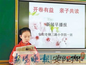 新闻早播报、阅报活动总结、家长心得体会、学生心得体会……自该校参加殷都区“开卷有益 亲子共读”活动以来,活动不仅在校园进行得如火如荼,在每个学生的家庭中也有声有色。“我们每期做的剪报都有一个主题,需要翻阅很多报纸,然后剪下来把它们拼在一起。”一位五年级学生告诉记者,剪报让读报变得更有趣。“剪报不仅锻炼了孩子们的动手能力,也锻炼了他们的创新意识,孩子们的作品让人眼前一亮,很有特色。”市钢三路小学老师岳健说。