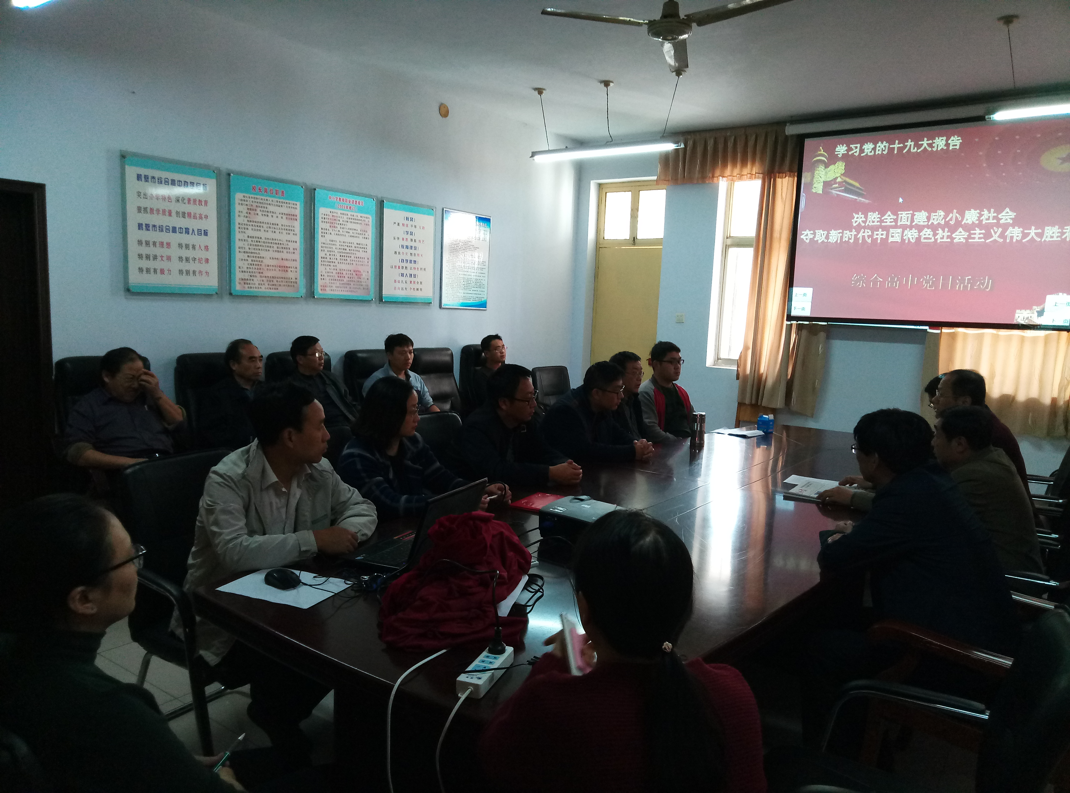10月25日,在十九大闭幕后,鹤壁市综合高中召开党支部会议,共同学习习总书记十九大报告《决胜全面建成小康社会 夺取新时代中国特色社会主义伟大胜利》。党员老师们听报告、谈体会、说打算、谋未来,并在各自的工作岗位上,努力用崭新的精神状态迎接十九大时代到来:党员刘玉峰老师表示:要认真学习贯彻落实十九大精神,开拓进取,投身到实现中华民族伟大复兴的时代洪流中。党员老师徐兆利表示:习总书记对基层党组织重要性的论述,让我们基层党员干部无比激动,我一定发挥党员教师的战斗先锋作用……