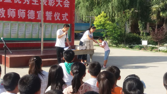 开学仪式由沈一娜老师主持。首先是为上学期的优秀生颁发奖品。第二项是张金涛校长的新学期寄语。他希望新学期每一位师生要坚定一种信念,确立一个目标;培养一个习惯,孕育一种风气;珍惜一次机会,创造一个辉煌;创设一个安全、卫生、文明、有序的新环境。其次是李留芳代表三位新教师进行了发言。她说,她们要努力改变教育观念,加强课堂教学,严格要求自己,认真做好本职工作,关注每位学生,做学生的引导者,充分运用启发式、讨论式、诱导式的教学方式,上好每一节课,激发同学们的学习兴趣,培养学生独立思考能力和创新意识,践行自的神圣职责!李老师的发言赢得了师生们的热烈掌声。最后是全体教师在国旗下举行庄严的誓言宣誓仪式。老师们高举起右手,庄严宣誓:忠诚党的教育事业,贯彻党的教育方针,履行教师神圣职责。修身立德,为人师表,做一个品德高尚的人;追求真理,崇尚科学……句句誓言铿锵有力,整齐响亮的声音回荡在美丽校园的上空……