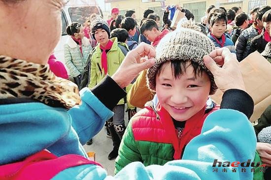 见到来自郑州的客人,这里的198名学生还有点怯生。志愿者们拿着“温暖包”走进孩子们中间,逐一发送。为了看看袋子里的围巾帽子是否合适,他们还给孩子们戴上试试。当得知这些漂亮暖和的编织品是郑州爱心人士一针一线亲手完成的,孩子们特别感动。一年级的仝梦莹小朋友说:“我从来没戴过这么好看的围巾,它真的是我的吗?”当得到志愿者的肯定后,她笑得格外甜美。