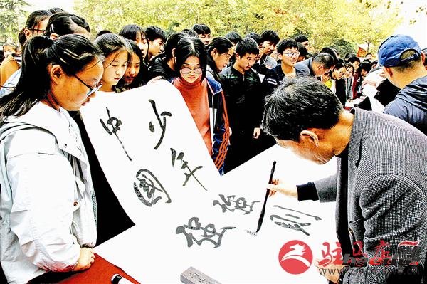 丹青妙笔绘盛世,翰墨飘香谱华章。10月23日,市一高操场上彩墨飘香,一派热闹景象。由天中书画艺术研究会主办,市一高承办的“翰墨进校园、献礼十九大”我市知名书画家千米长卷展示活动隆重举行。天中书画艺术研究会的书画家们与市一高师生开展了一场面对面的书法传承与交流活动。