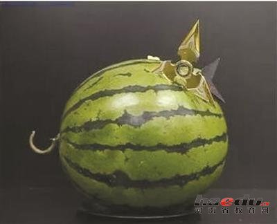 弹射玩具“威力”大,能轻易地切入西瓜。