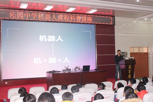 为加快推进学校综合课程建设,沁园中学派专人到经济发达地区广州实地考察,与广大省海泓科技海客机器人课程中心、中山大学机器人实验室达成了机器人教育课程建设的意向,计划从2016年开始在沁园中学七年级学生中全面开设机器人课程。本次讲座由中山大学机器人实验室、海客机器人课程中心成功创业中山大学生王舒然主讲。他以机器人的定义和发展历史作为切入点,用生动形象的PPT和精彩的视频向同学们介绍了机器人的原理构造、实际应用以及发展前景等科普知识,并对海客机器人课程中心在智能机器人设计、参赛、获奖等方面的情况也做了详细介绍。