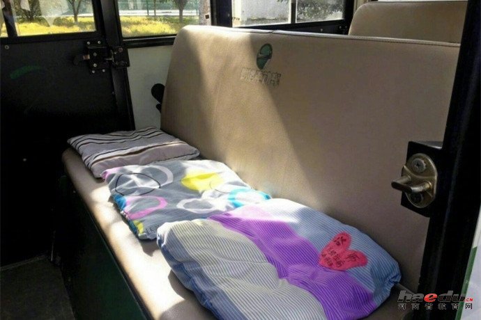 洛阳师范学院的女生们亲手为校车公交车缝制坐垫