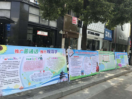 为切实做好推普宣传,内乡县城关镇中心学校、内乡初中、实验初中、县直幼儿园等学校认真部署,集中在县衙广场路口展出了四十余块宣传版面,这些版面内容丰富、形式多样,为广大群众喜闻乐见。如内乡五小的版面内容,色彩鲜艳,内容充实,既有严谨的法律条文,又有幽默的方言故事,图文并茂地阐述了《中华人民共和国国家通用语言文字法》以及推广普通话的意义,吸引了不少过往路人驻足观看,大家纷纷感叹:"说普通话就是好,能促进大家语言规范,交流畅通!""今后我在生活中也要说普通话,并且让我们一家人都说普通话!"