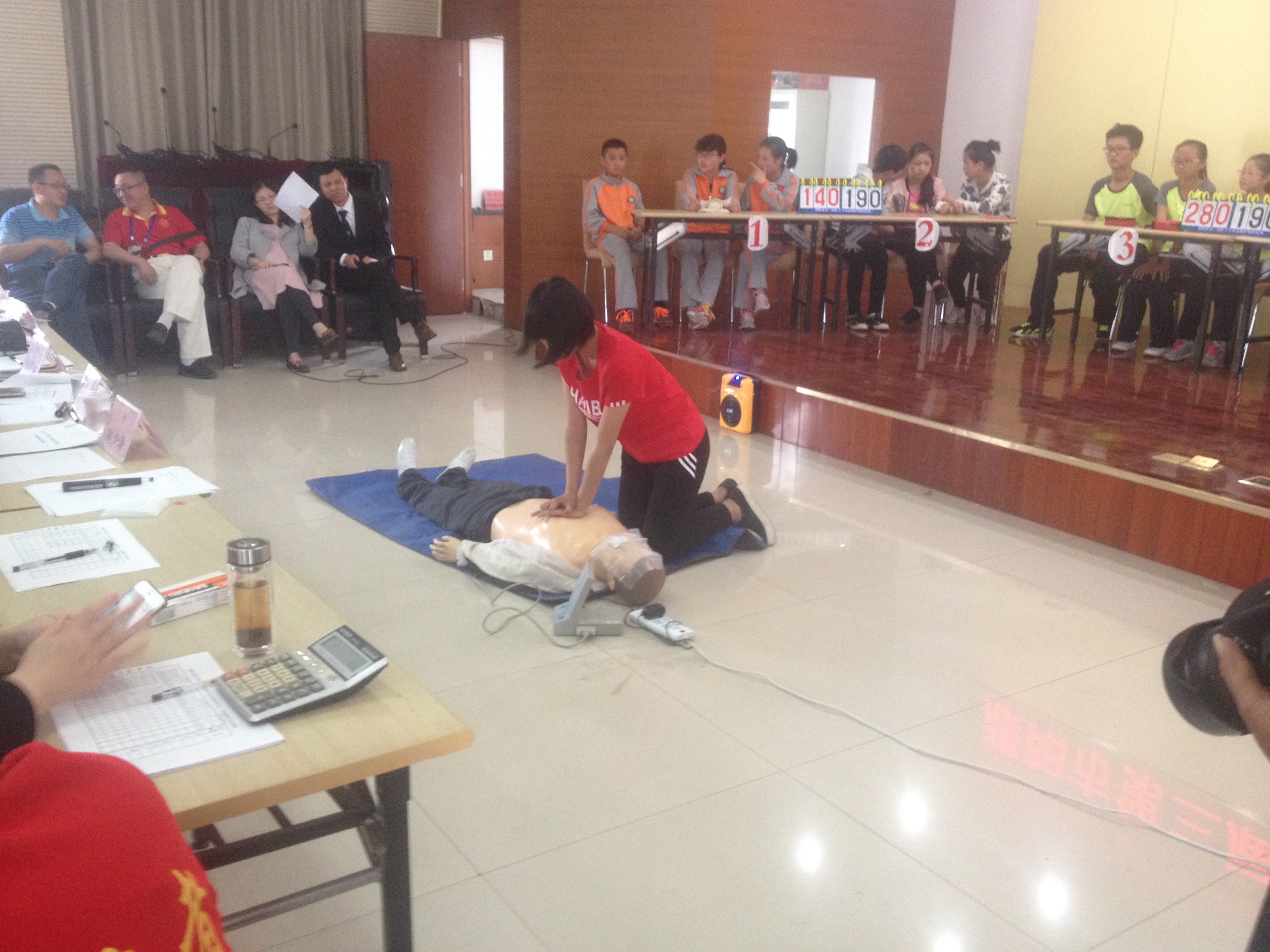 此次比赛分为应急救护知识理论比赛和技能竞赛两部分,知识竞赛主要包括红十字运动知识和应急救护理论知识,技能竞赛包括心肺复苏、止血、包扎、固定技能和搬运技能。在技能比赛中,每个参赛队都表演了心肺复苏和包扎止血的操作。