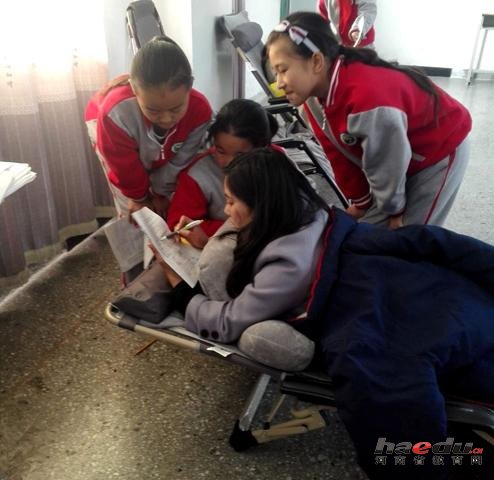 下课后,郝晶晶在学生的搀扶下回到办公室,趴在折叠床上接受了记者的采访。她说,11月9日(周四)早上7点,下楼去上班时突然仰面摔倒,身体特别的疼,自己无法站起。最后,还是同事赶到后把她送进医院。经检查医院诊断为:尾椎损伤,不能躺、不能坐、不能长站。一番治疗后,医生建议休养月余。“眼看就期中考试了,这几天学习对孩子们非常宝贵,我哪有心在家休息啊?13日(周一)早上,我就强忍着疼痛到学校上班了。班里的孩子们见了我特别兴奋,一片欢呼,围着我问前问后,还要拥抱我,给我叠了好多玫瑰花,让我很受感动。我心想,就是面对再大困难我也不能让学生的成绩落下。”郝晶晶说。不能坐、不能躺、不能长站,她就让家人给她买了一张折叠床放到办公室里,趴到床上写教案,批改作业、试卷,为孩子辅导功课。“没想到,这一幕竟被同事用手机给拍了下来,有点不很雅观,让大家见笑了。”说到此,郝晶晶显得有点不好意思。