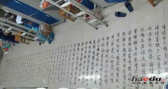 谁说书法只能在纸上写,河南高校一位学生为了练习书法,已经将目光盯上了宿舍的地板,用行书在地板上写下了千字文。