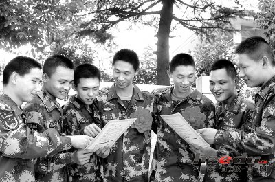 8月24日,双双考入武警特警学院的双胞胎兄弟黄国柱(右四)、黄国浩(右三)与战友们一起分享喜悦。黄国柱、黄国浩兄弟俩是河南总队信阳支队固始县中队战士,出生于江苏省启东市,父亲早逝,兄弟俩2014年分别被南京航空航天大学和南京工业大学录取。同年9月,听到征兵的消息后,哥俩报名参军。在军营里,他们相互学习、相互鼓励,相互较劲、相互追赶,被大家誉为中队的“拼命二郎”。