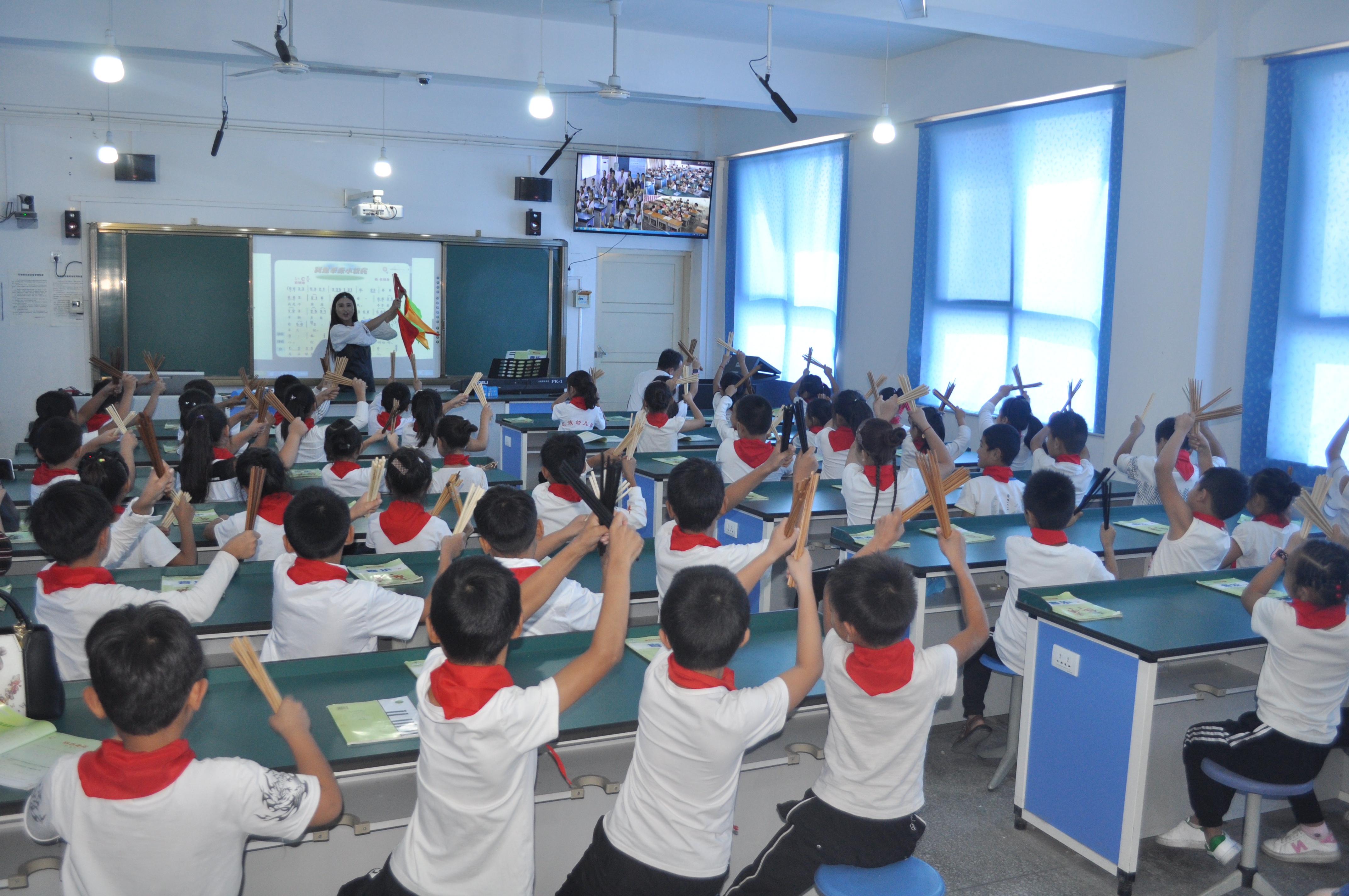考察团一行首先来到朝歌镇西街中心小学网络直播互动教室,察看了该校教师采用"异地同上一节课"新颖教学模式进行授课情况,该校优秀青年教师白水晶正在讲授音乐课《蒙古族》,本校三年级以及自己的结对学校桥盟乡赵构小学三年级和黄洞乡黄洞小学三年级三个班同上一堂音乐课,同时与白老师互动,同时完成学习任务。大家对异地学生足不出校就能享受到区域优质教育资源的熏陶,留下了深刻印象、赞叹不已。