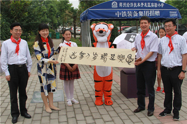 在郑州经开区实验小学,少先队员为大朋友们佩戴上鲜艳的红领巾。与会领导兴致勃勃地观看了该校第二届足球文化艺术节梦想体验秀活动,区王华耀副主任还为孩子们送来了自己的书法作品作为礼物。在“吉祥物”投票区,看到学生们以“足球·运动”为主题的自制足球、足球创意作品,领导们也纷纷为满意的“吉祥物”投上一票。在趣味游戏区,几位大朋友也禁不住参与其中,体验运动的快乐。前国家队女足队长范运杰、河南省校足办宣传部副部长、中原一校一品研究指导中心秘书长常乐应邀与实验小学女足队员、玫瑰之星陈雅文、张瑜进行了激烈的比赛,大朋友牵手小朋友尽情感受运动带来的快乐。