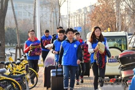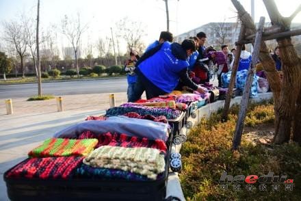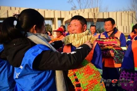 12月21日下午3点30分,河南郑州东区华北水利水电大学北门的龙子湖南路上,来自该校的几十名大学生怀里抱着一条条五颜六色的的围巾,送给附近的环卫工人。