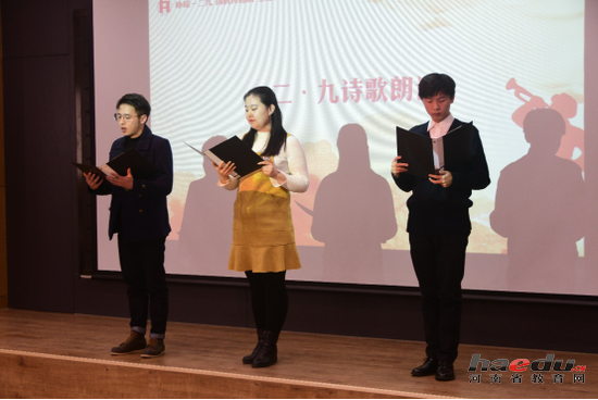 本次开幕式还有一个特别设计的活动——一二·九诗歌朗诵,来自不同学院的三位学生用慷慨激昂、饱含热情的声音朗诵《历史不会忘记》,带领全场师生回到了那热血澎湃的一二·九历史当中。