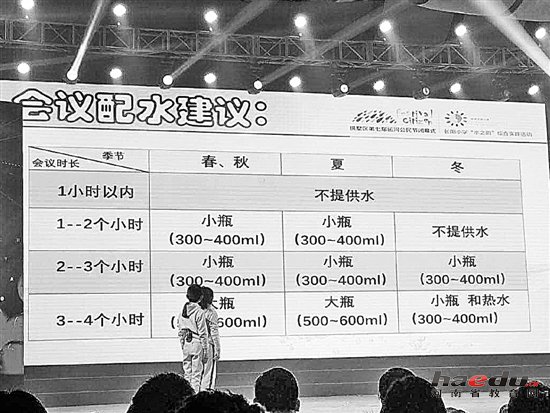 1小时以内的会议,不提供瓶装饮用水;1~2小时的会议,在春、夏、秋季提供小瓶水;3~4小时的会议,冬季配小瓶水,其余季节配大瓶水——杭州一所小学的学生根据身边的事例开展节水研究,建议按照时长、季节的不同需求调整会议配水。