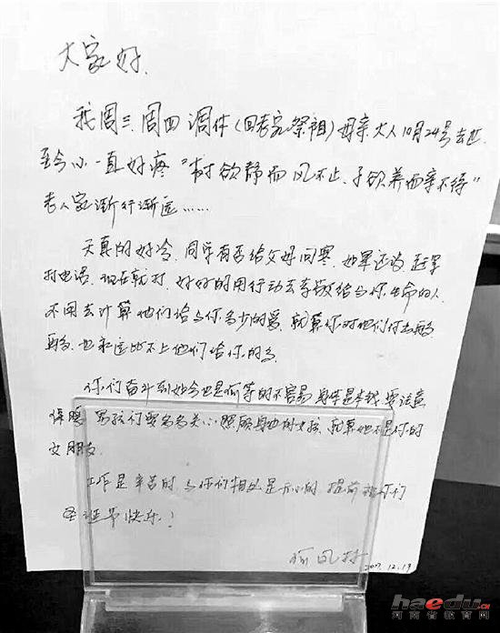 有学生透露,何师傅很爱他的母亲,曾陪母亲去普陀山,只为了却她的夙愿。母亲去世后,他的内心一直都很沉重。12月19日那天,因为要返乡祭祖,他特意在下班前给师生们写了一张请假条,虽然仅短短几百字,一个“疼”字却朴素地诠释了什么叫爱之深切。