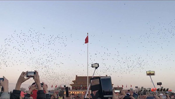 “现场气氛高潮是国旗到顶,放鸽子那一瞬间。”任为提供的视频显示,国旗升到最高点后,成群的白鸽放飞,现场响起一阵阵欢呼声。