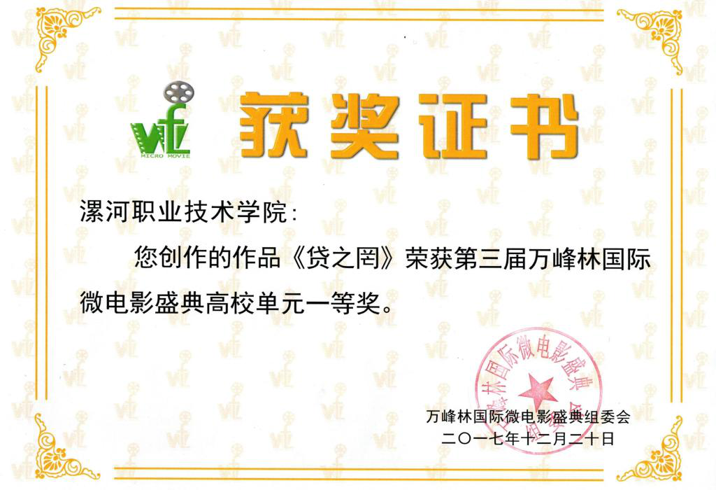 近日,第三届万峰林国际微电影盛典在贵州兴义隆重开幕,漯河职业技术学院微电影作品《贷之罔》荣获一等奖,同时该院还荣获本次“盛典”的优秀组织奖,成为全国唯一获此殊荣的高职院校。