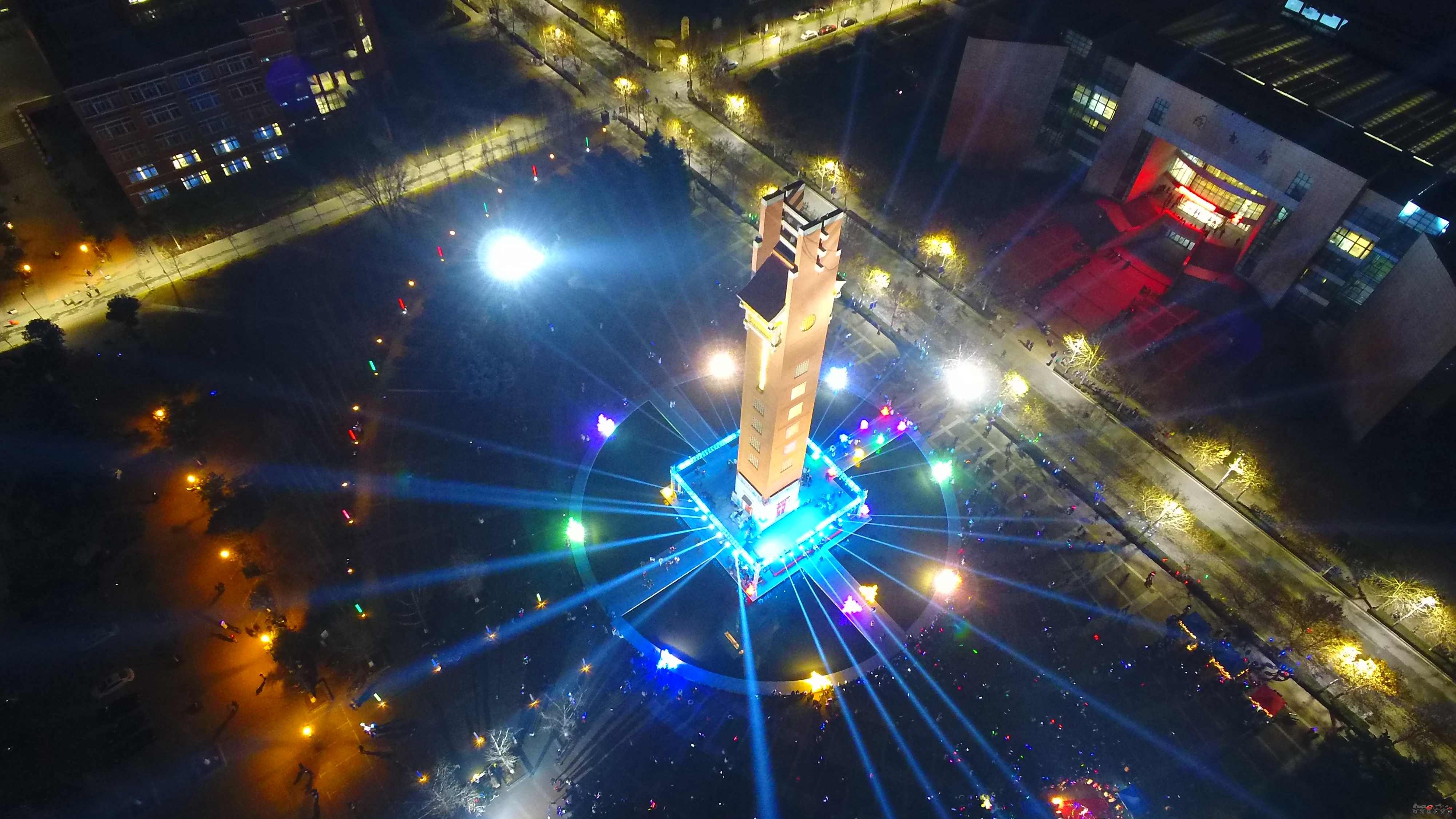 师生携手歌盛景,万人翘首盼新年。22时许,元和广场渐渐热闹起来,拼拼图赢奖品,你画我猜增情谊,写下心愿盼来年……丰富多彩的活动为迎新年钟声联欢会预热气氛。树上挂满霓虹灯,一束束光如同流星雨般从树上滑落,颜色绚丽的“火树”围在钟楼四周,在动感的音乐下,成了一片光的海洋。