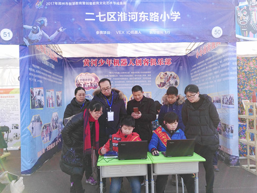 12月16日,在郑州一中经开区实验学校举行的“2017郑州市智慧教育暨创客教育文化艺术节成果展”活动中,二七区淮河东路小学被正式命名为郑州市创客教育示范学校。
