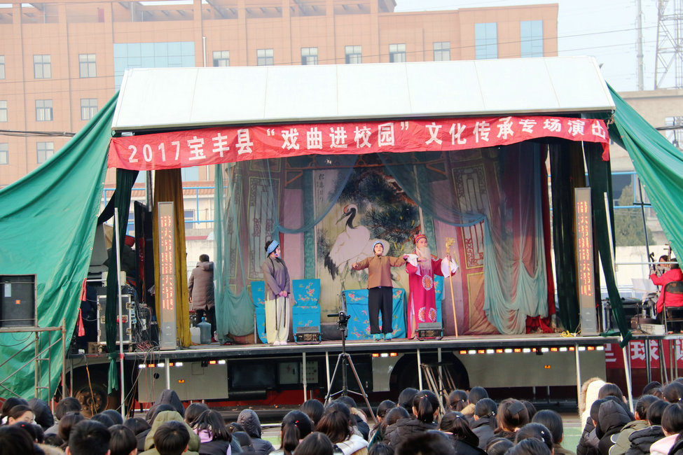戏曲是中国传统艺术之一,剧种繁多有趣,表演形式载歌载舞,有说有唱,有文有武,集“唱、做、念、打”于一体,在世界戏剧史上独树一帜。12月4日下午,宝丰二高高一、高二年级全体师生齐聚学校足球场,共同欣赏由宝丰县委宣传部、宝丰县教体局、宝丰县文广局、宝丰县财政局、宝丰县豫剧团为大家带来的一部精彩经典戏剧——《三娘教子》,开展“戏曲进校园”活动,近距离欣赏传统戏曲表演技艺,真切感受传统戏曲的魅力,上了一堂意义深远的中华优秀传统文化教育课。